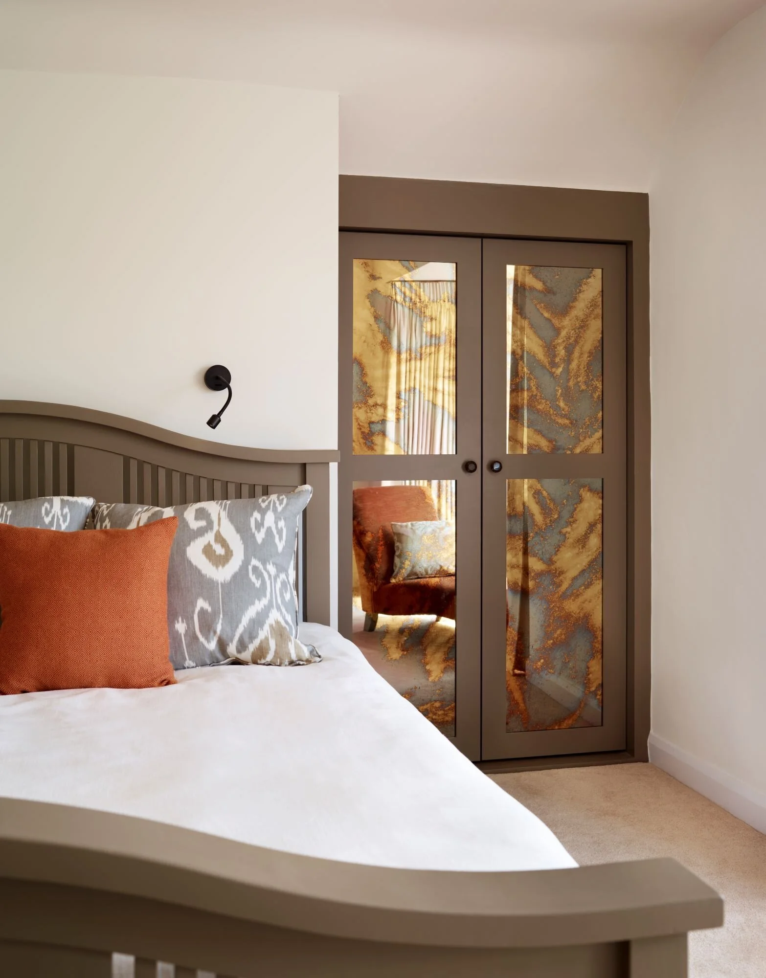 In West London, we created a master bedroom with connecting dressing room, a new doorway was put in complete with vintage door to match the 1930s bedroom door. The old wardrobes were removed to widen the room and we designed new wardrobes and cabinetry around the chimney breast fronted by hidden pigeon-hole shelving to house new electrics and cabling for all lights, amplifier and ceiling speakers.